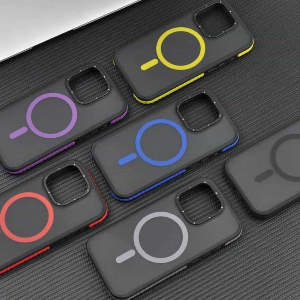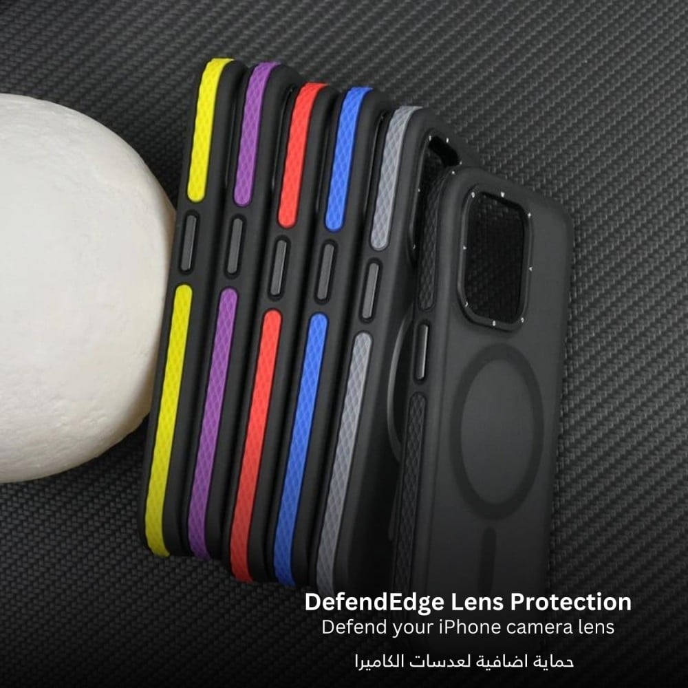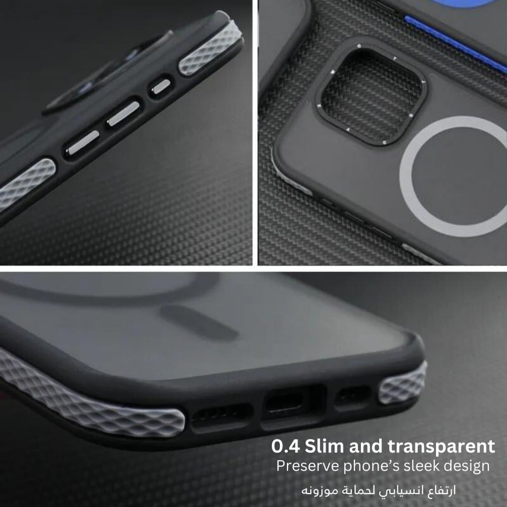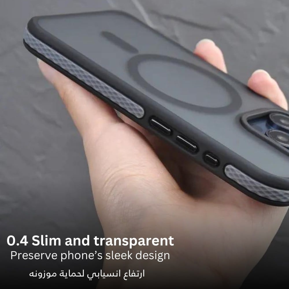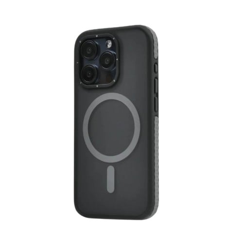 كفر حماية ايفون بتصميم فريد ومميز مع خاصية الماج سيف باللون الاسود باطراف رماديه يوفر الحماية لهاتفك الأيفون 15 برو و برو ماكس بشكل كامل وفعال.