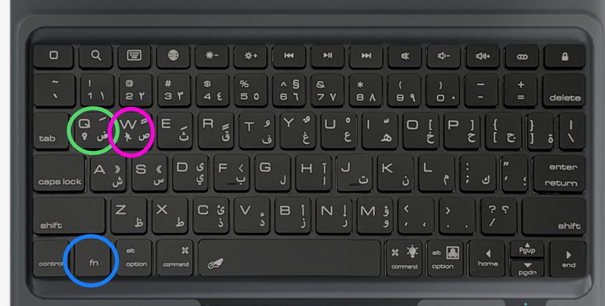 يمكن تعديل قوة الانارة الخلفية بثلاث درجات من خلال الضغط على زر FN باستمرار ( موضح في الصورة ادناه باللون الاحمر )