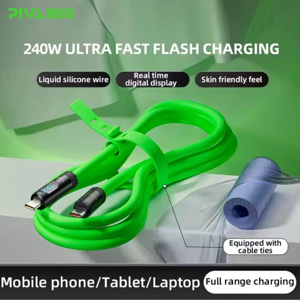 سلك شحن تايب سي من Piva بطول 1.5 متر مع شاشة مدمجة لعرض حالة الشحن و البطاريةمن نوع USB-C عالي الجودة مصمم لتوفير شحن سريع ونقل البيانات، مصنع من مادة السيلكون المقاومة للأتساخ.
