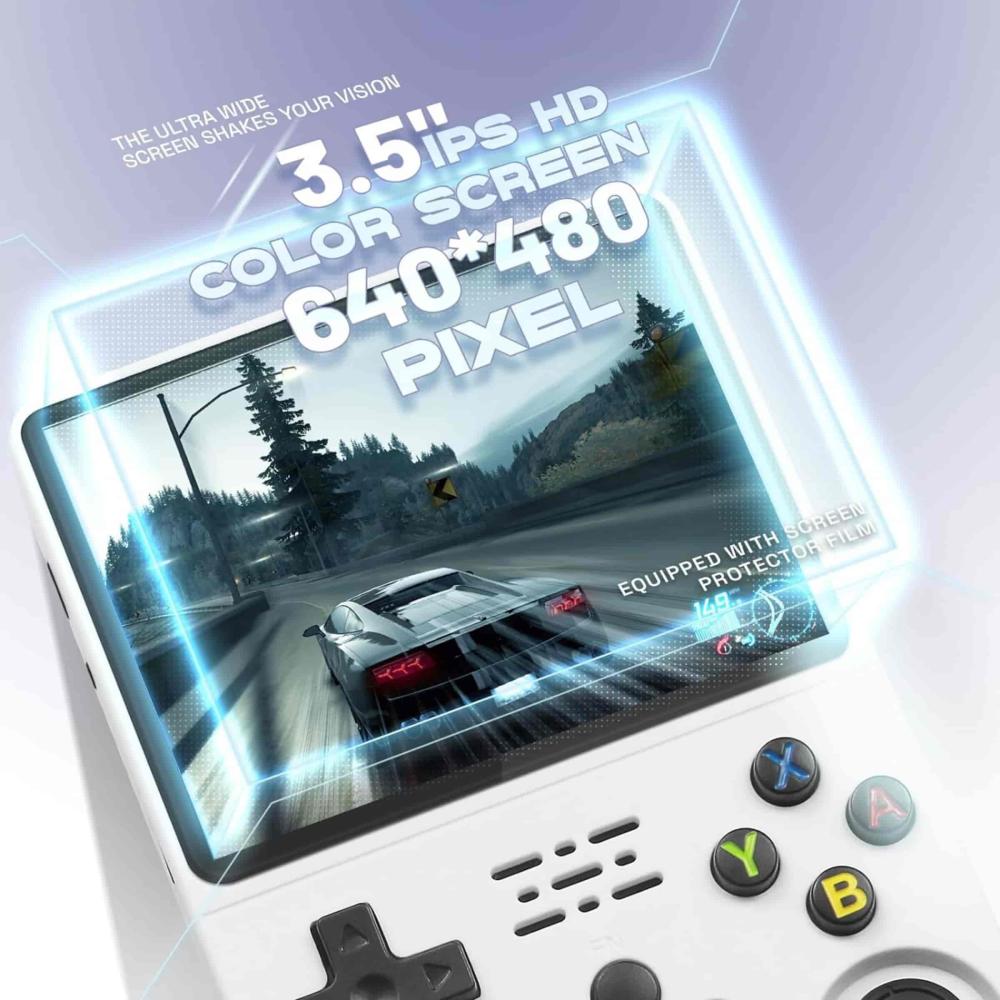 ياتي جهاز الألعاب المحمول بشاشة لوضوح مذهل مقاس 3.5 انش لتجربة لعب افضل ويمكن حمله . و ببطارية سعة 3500 تستمر بالعمل ل 6 ساعات
