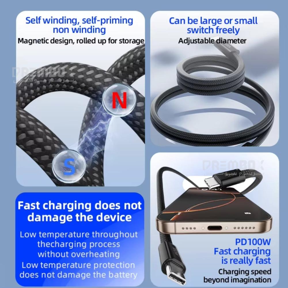 Piva Universal Magnetic Self-Coiling Aluminum Alloy Type-C to Type-C Cable – PD100W Fast ChargingThe Piva Universal Magnetic Self-Coiling Cable is a high-quality data and charging cable designed to offer a smooth and efficient user experience. It features a self-coiling magnetic design that makes storage easy and prevents tangling.