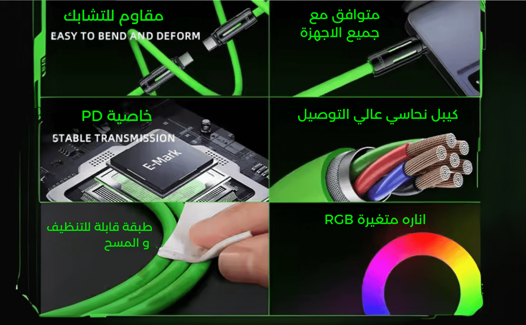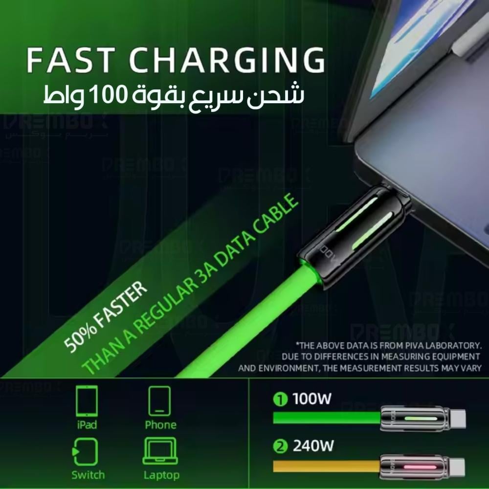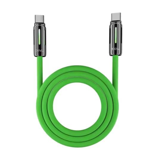 Fast Type-C charging cable with up to 100W power output, featuring a soft, anti-tangle silicone design and stylish RGB lighting.