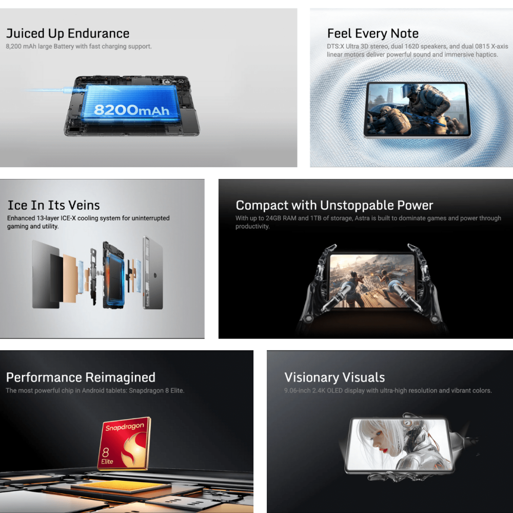 REDMAGIC tablets are known for their advanced cooling technology. The Astra comes with the ICE-X 13-layer system, which includes a vapor chamber, copper plates, graphite layers, a 20,000 RPM cooling fan, and liquid cooling for highly efficient heat dissipation.